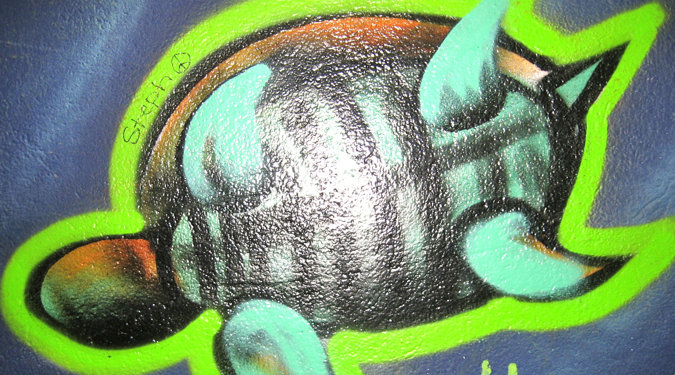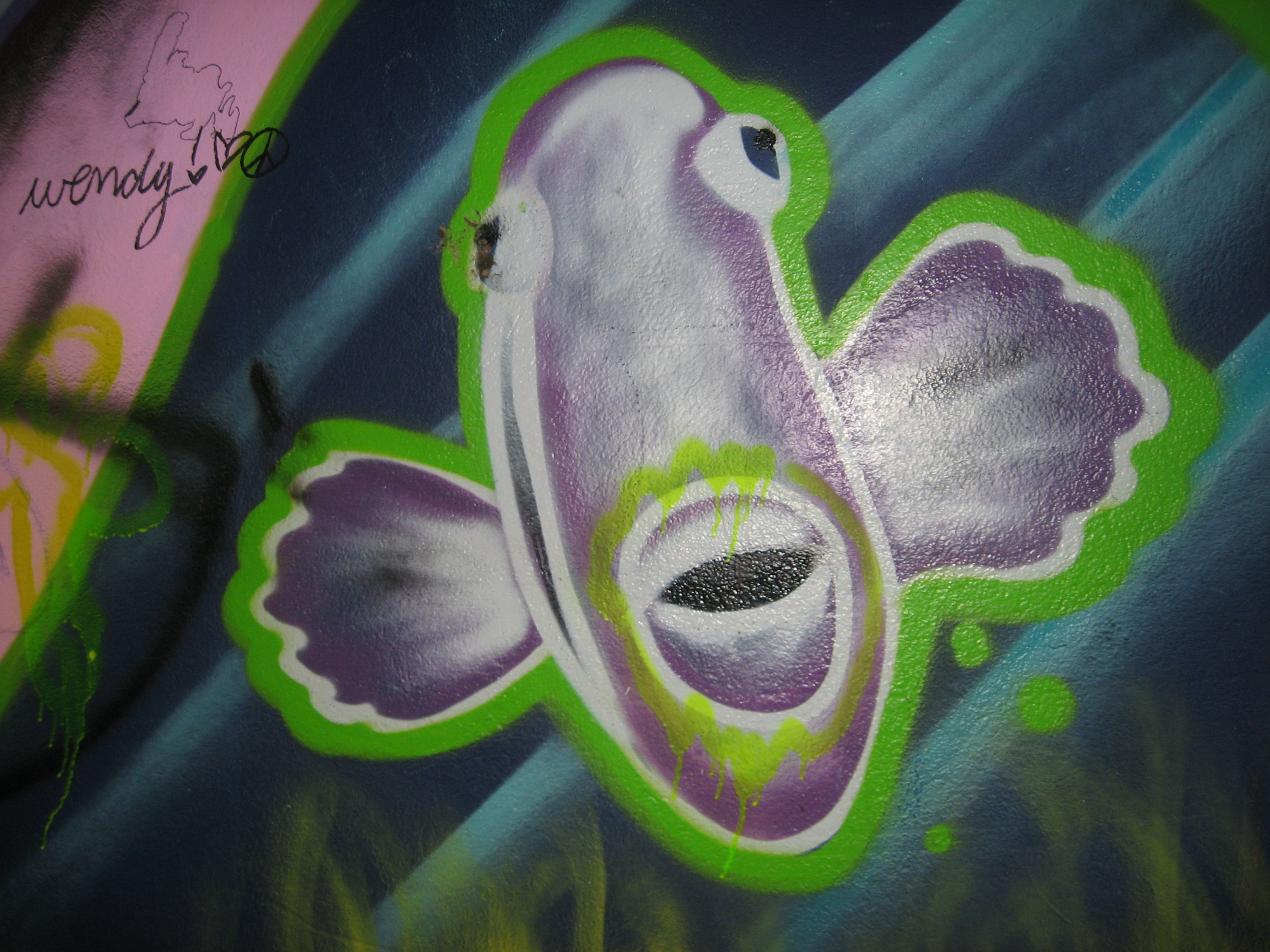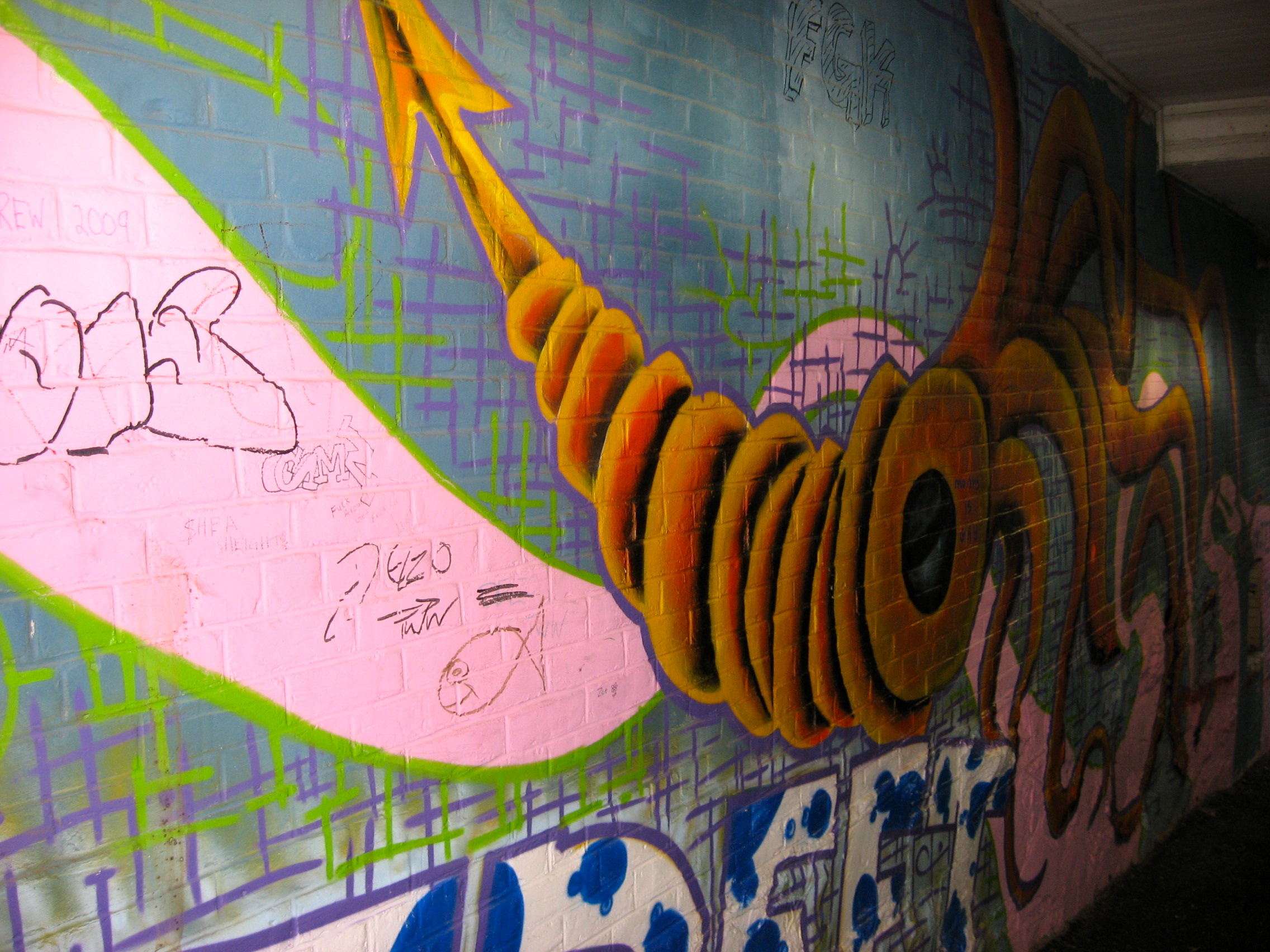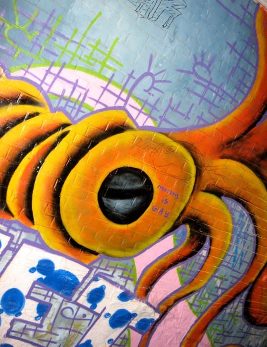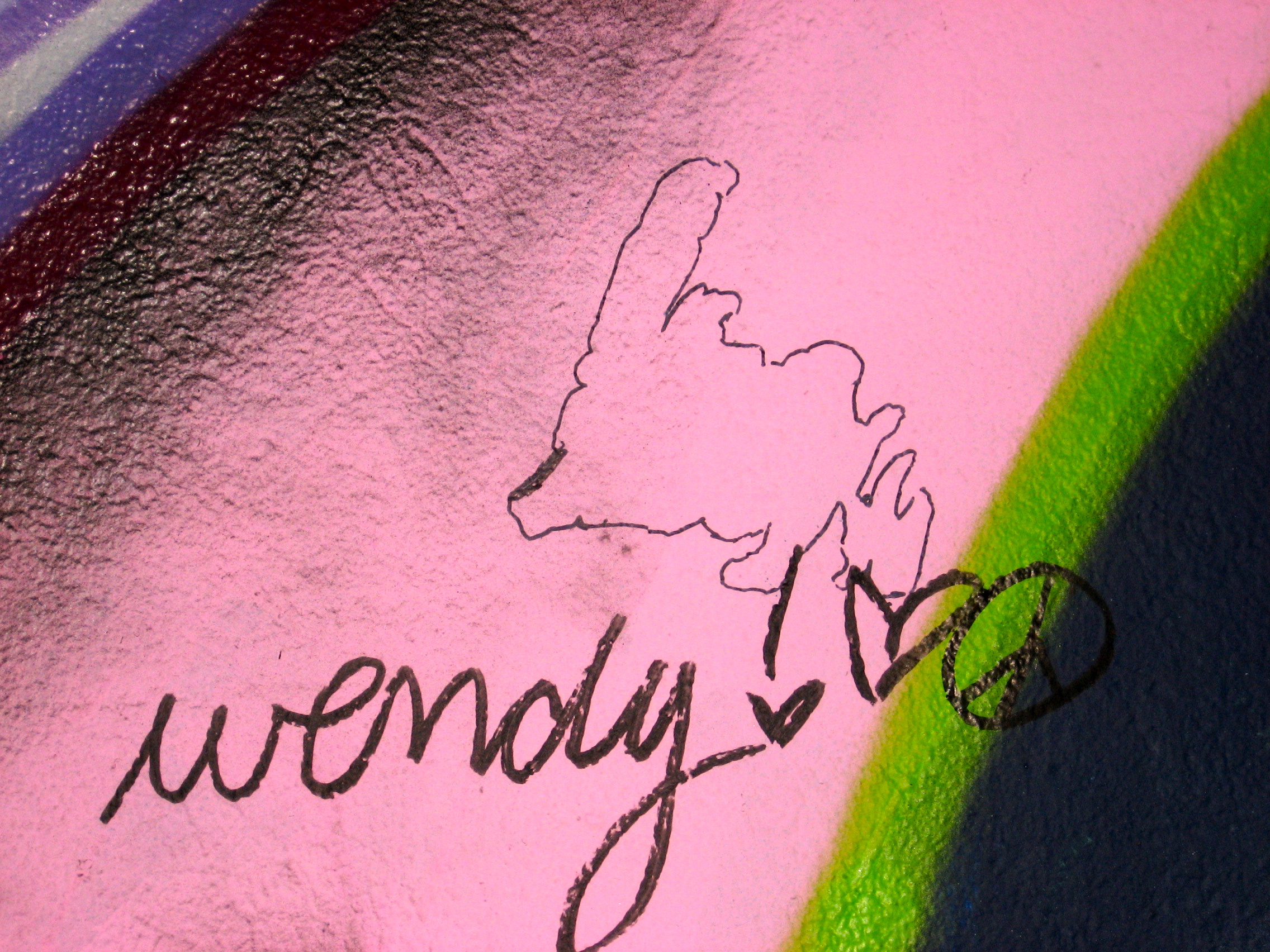 The many laneways of downtown St. John’s Newfoundland offer plenty of colourful encounters. “Legal Graffiti” spaces help revitalize lane ways in the downtown area. Many people would normally not walk through this walkway photographed here because “it was so dingy and it looked so bad”. Now, because of the graffiti many more people travel through the back lanes.