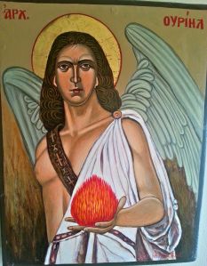 Icon of Archangel Uriel: I found an Iconographer Greek Orthodox Monk in Athens. Told him my story and what I saw in my dream. He painted this image of Uriel in traditional Byzantine style on wood.