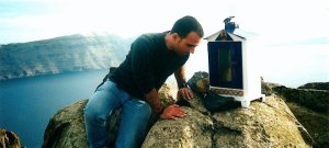 December 2000, building my shrine overlooking the caldera of an ancient volcano. Location: outside Oia village, on a remote hiking trail northern tip of Santorini Island.